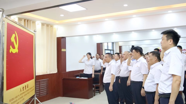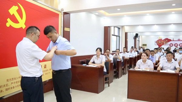 接著,在王高峰同志帶領下,面向鮮紅的中國共產黨黨旗,新、老黨員舉起右拳、莊嚴宣誓,鏗鏘有力的誓言響徹會場,短短80個字的入黨誓詞,震撼著現(xiàn)場每一位黨員。