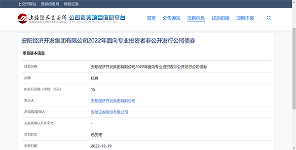 12月16日,集團(tuán)收到上海證券交易所通知,集團(tuán)報(bào)送的非公開發(fā)行公司債券并掛牌轉(zhuǎn)讓的申請,上交所按照相關(guān)規(guī)定已予受理。本期債券名稱為安陽經(jīng)濟(jì)開發(fā)集團(tuán)有限公司2022年面向?qū)I(yè)投資者非公開發(fā)行公司債券,品種為私募債,金額15億元,承銷商/管理人為安信證券。