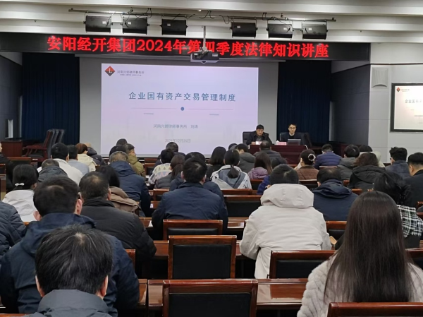 12月25日上午,河南興鄴律師事務(wù)所劉濤律師應(yīng)集團(tuán)邀請?jiān)谑胸?cái)政局綜合會議室,以“企業(yè)國有資產(chǎn)交易與管理制度”為主題,為集團(tuán)全體員工進(jìn)行法律知識宣講。集團(tuán)黨委委員、監(jiān)事長謝俊生主持本次講座,集團(tuán)領(lǐng)導(dǎo)班子成員及全體員工參加了講座。